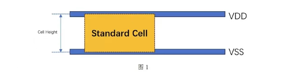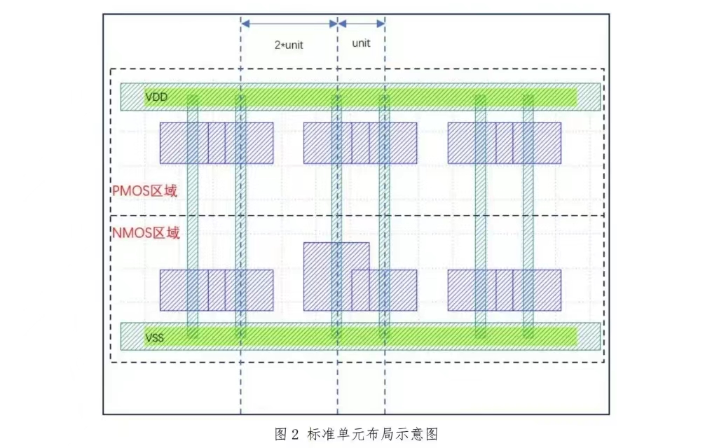 在标准单元的内部,晶体管按两行依次放置,PMOS晶体管在上面一行,NMOS 晶体管放在下面一行,本题中所有晶体管的有源区向电源轨道对齐,如图 2,详细描述见赛题描述。