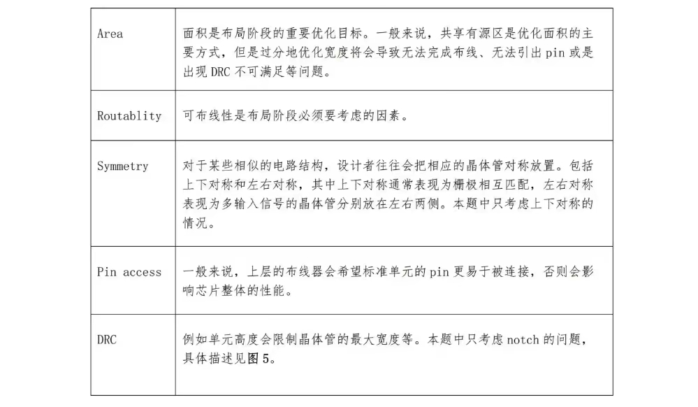 在现有的标准单元布局算法的研究中,对面积和可布线性的优化算法已经有较多的参考。但是由于缺乏对其他内容的考虑,算法自动生成的布局通常无法直接被使用,尤其是在一些较为复杂的标准单元中,版图工程师往往需要花上 1-2 周的时候去调整和优化布局。